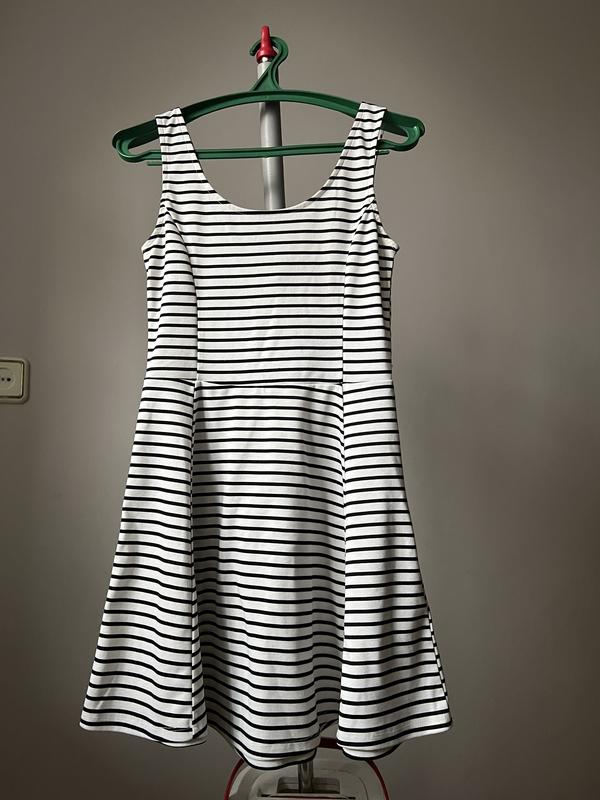 Летнее платье в полоску, очень удобное в жару, так как можно носить без бюстгальтера. На рост 168 длина до колена. На спине более глубокий вырез нож спереди, на грубых брителях.