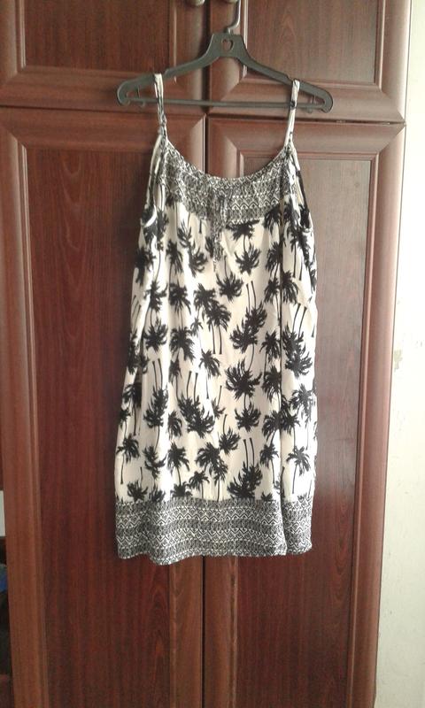 Сарафан с пальмами гавайский черно-белый принт длины мини . MARKS & SPENCER .Батал .Вискоза 100 % купонный гавайский принт орнамент ,пальмы ..На тонких регулируемых бретелях .Замеры :ПОГ-57 , ПОТ- 63 , ПОБ-68 , Длина от подмышки -67 .