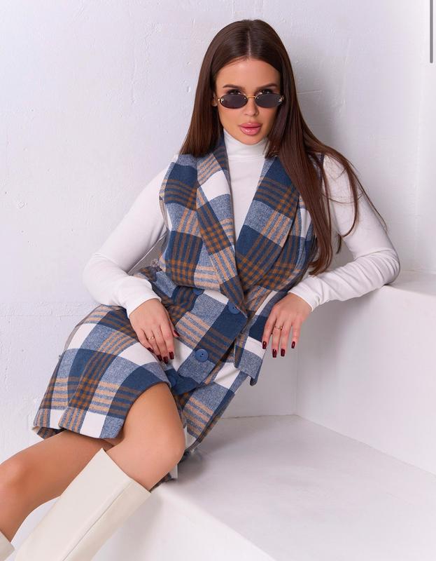 Шерстяное платье-тренч без рукавов с длиной до колен и принтом в клетку. Платье облегающего кроя с двубортным кроем на пуговицах. Модель с английским воротником и клапанами. Модель без нижней подкладки. Лонгслив в комплект не входит. Размеры Полуобхват S M L XL Груди 44 46 48 50 Талия 40 42 44 46 Стегна 44 46 48 50 Длина изделия: 92 1493