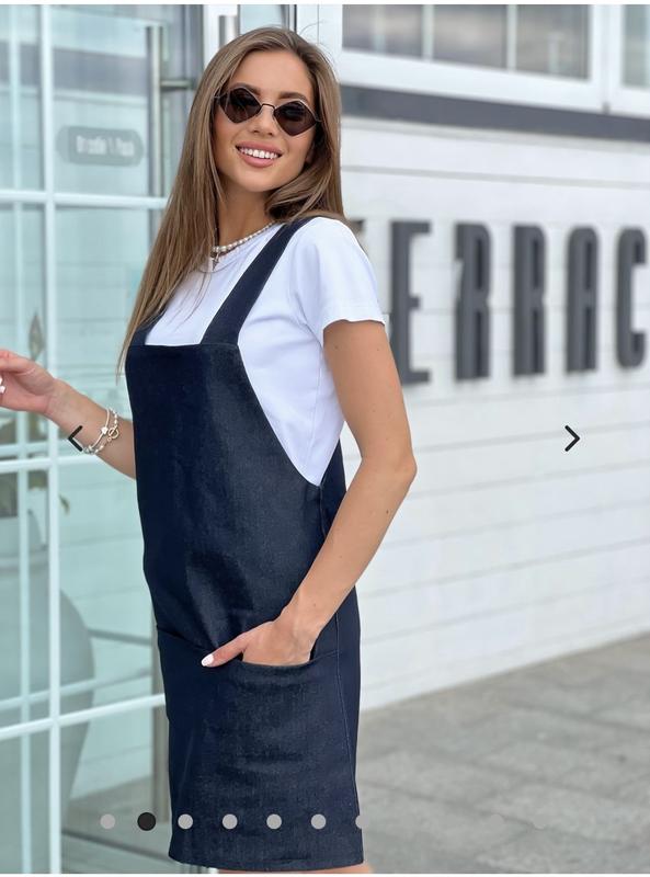 Стильный джинсовый сарафан насыщенного оттенка. Фасон дополнен потайными карманами и декорирован металлической молнией по спинке. Сарафан выполнен из ткани деним. Детали: тайные карманы, молния. Состав: 80% хлопок, 20% вискоза Цвет: темно-синие Длина по спинке: 90 см Рост модели: 167 см Размер Л на параметры 98-78-100 В носке не был