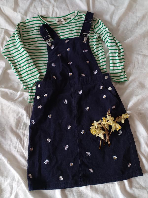 Сарафан мелкий вельвет. Спереди цветочная вышивка. Два кармана. Застежка на лямки и две пуговицы по бокам. Сзади вышивки нет. Размер S, небольшая M. Стан - идеальный. Натуральный состав ткани.