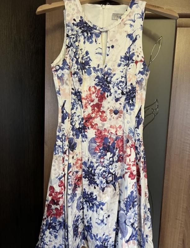 В наличии женский сарафан Очень милое коттоновое платье (сарафан) на подкладке из полиэстра. Идеальная посадка, красиво сидит по фигуре. Сзади потайная молния и крючок. На плечах специальные кнопки, чтобы закрепить бретели лифчика и они не выглядели из платья. Длина по спинке 89 см Ширина по плечах 27 см Под руками 42 см