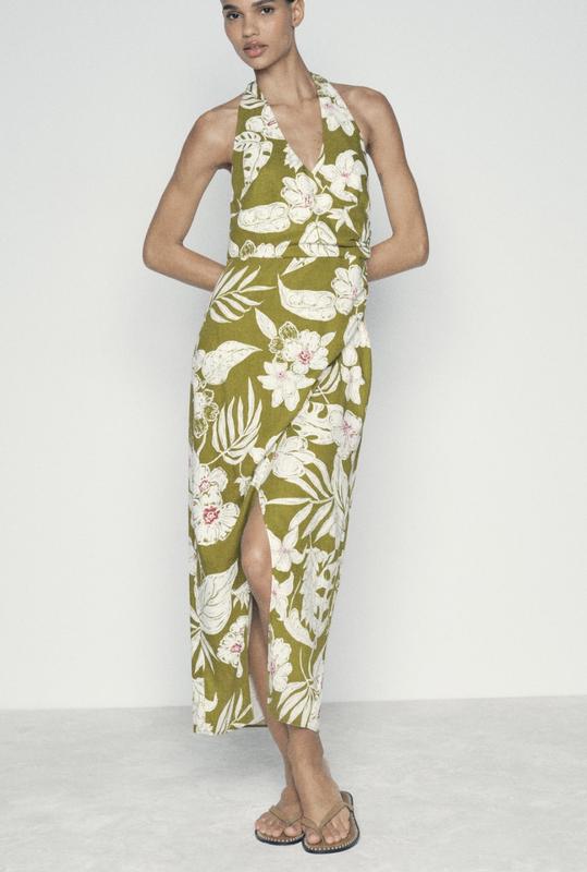 Сукня сарафан плаття Zara льон лляне. Сукня зі змішаної лляної тканини із запахом та зав'язуваними ззаду бретелями. Зборки на боках на поясі. Розріз спереду внизу. Застібається на приховану блискавку збоку.