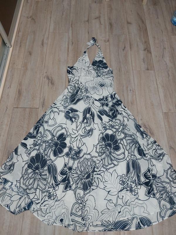 Сарафан платье в пол с открытой спинкой синий принт на подкладке очень тоненький не тянется. завязывается за шеей и молния по всей спине, шикарно садится. Легкое почти не ощущается талия 43 грудь 48
