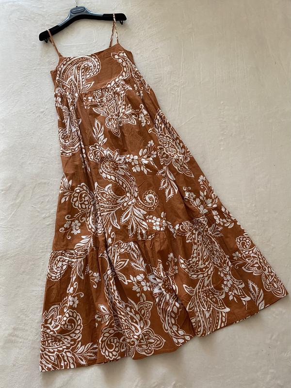 Дуже милий жіночний візерунчастий максі сарафан від M&S 🤎 У дуже класному смачному коричному відтінку ! У різноманітний романтичний контрастний візерунок пейслі На тоненьких бретелях А тканина- просто невагома! Аж хрустить! Тонесенький та натуральний батист! Нічого кращого на літо, на спеку- не існує!! 💯 бавовна Ззаду на спинці широка резинка Вільний фасон, бедра вільні, Розкішне драпіювання нижньоі частини Сукня нова Розмір С /хс Довжина 136 плюс мінус ПоГ 36( і поюс тягнеться, до 46 за рахунок спинки-резинки) Бретелі регулюються