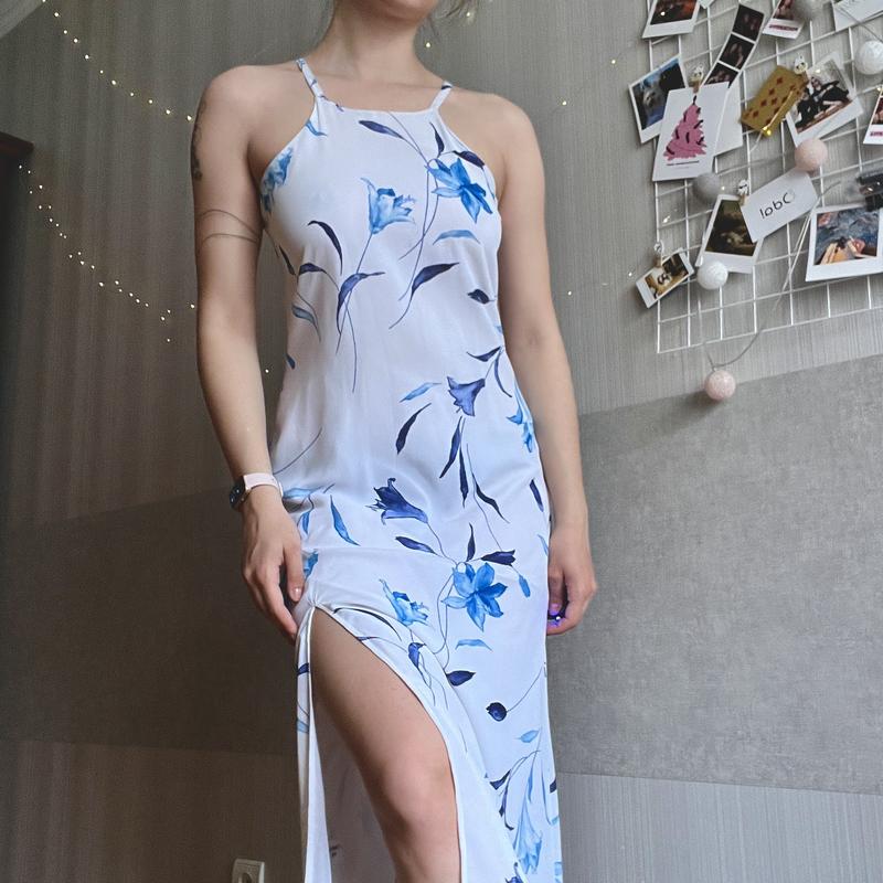 Легкий максі сарафанчик з шифону, всередині підкладка трикотаж. На бретельках, ззаду гудзик на шиї. На лівій ніжці розріз На фото одягнено на зріст 175, ОГ 98, ОТ 74, ОБ 100 Заміри: Під пахвами 44 Талія 37 Стегна 50 Пройма 26 Довжина до початку розрізу 78, повністю 136 Висота бретельок 10 см
