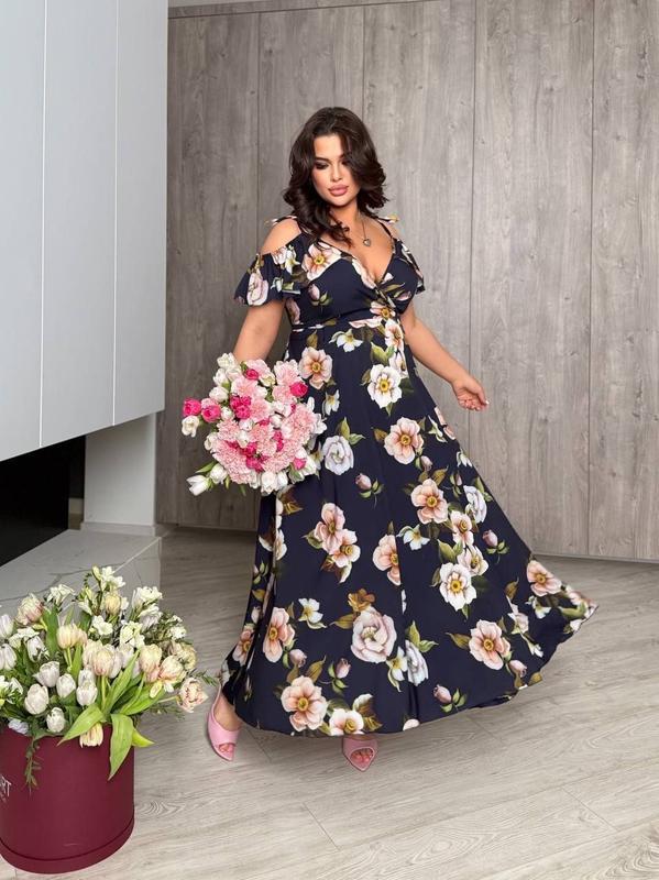 СУКНЯ НА ЗАПАХ Модель 1119 Легка вишукана сукня довжина макси Фасон «На запах», спідниця клёш Тонкі бретелі на зав'язках, з відкритими плечима та рукавами-крильцями на гумці Тканина: софт 1 розмір 48-54 довжина виробу від бретель 140 см ОГ від 100до 116 2 розмір 56-62 ОГ від 118 до 128