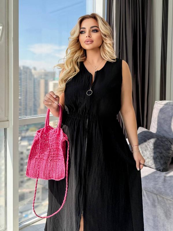 Женское летнее длинное платье сарафан миди на молнии лен жатка черная