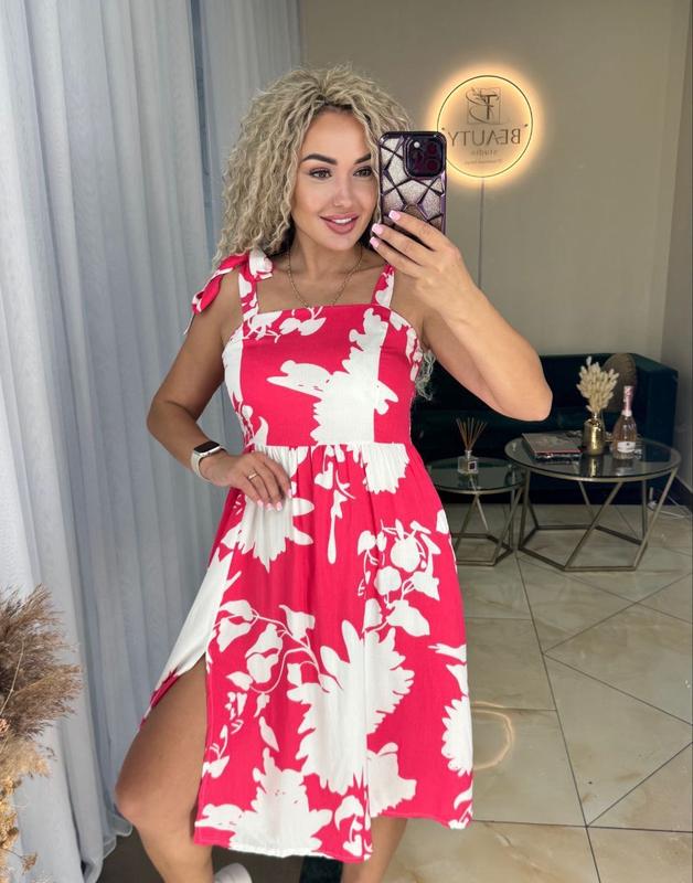 Сарафан міді на бретельках сукня з квітковим принтом плаття літнє з розрізом червоне біле...