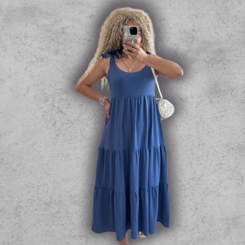 Сарафан длинный женский летний с пышной юбкой расклешенный на завязках а-силуэта синий
