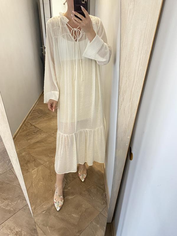 Довжина 129см; груди 62см; рукав від горловини 67см; ширина рукава 19см; по бедрах і талії вільно, але для орієнтування +-74см. Комбінація окремо, не підшита.