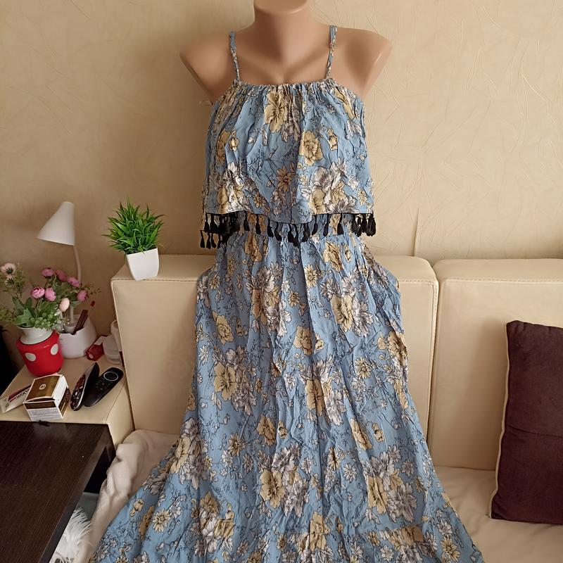 Легкое женское платье сарафан из вискозы. На регулируемых бретелях. Размер 16: ПОГ 50, ПОТ 33-54 (пояс на резинке), ПОБ 62, длина юбки 95, длина верха зависит от регуляционные бретелей ) 48 (может быть больше или меньше)