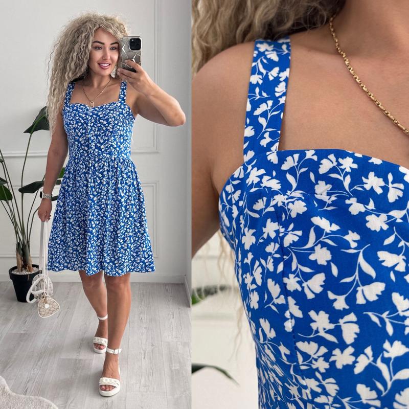 Женское летнее легкое короткое платье сарафан с цветочным принтом в цветочки штапель сине-...