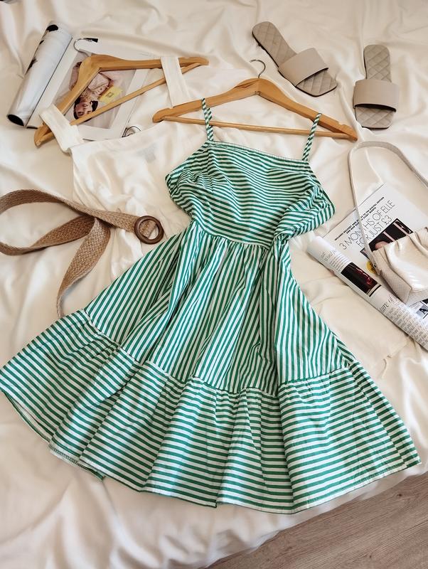 Сукня - сарафан New Look. 100% котон. Полосатый дизайн в зелено-белых тонах. В новом состоянии Размер 10, на XS-S. Длина 85 регулируется ПОг 41 + вытачки на объем до 88 ПОт 34 Поб свободно