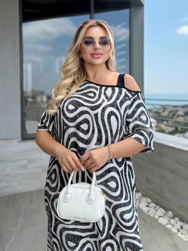 Оригинальное платье - сарафан, асимметричное на одно плечо. 258 МОДЕЛЬ mel Свободного кроя. В боковых швах карманы. Разрезы по низу. ▪️РАЗМЕР ПОДВОЙНЫЙ 1) 46-48; 2) 50-52; 3)54-56 ▪️ТКАНЬ ЛЬОН С ПРИНТОМ ЖАТКА ▪️ЦВЕТ : ЧЕРНЫЙ с белым; МОККО с черным; Сильней с белым. ▪️ЗАМІРИ на СУКНЮ 46-48 размер Объем груди 104 Объем бёдер 114 Длина изделия 134 Длина рукава 28 50-52 размер Объем груди 110 Объем бедер 120 Длина изделия 136 Длина рукава 30 54-56 размер Объем груди 116 Обʼєм стегон 126 Длина изделия 138 Длина рукава 31 НА МОДЕЛИ РАЗМЕР 50-52