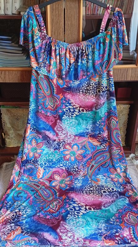 Состояние нового, ткань трикотаж-масло, растяжимость 3-5см. Длина от плеча 120см, ПОГ 55см, ПОТ 53см, ПОБ 62см.