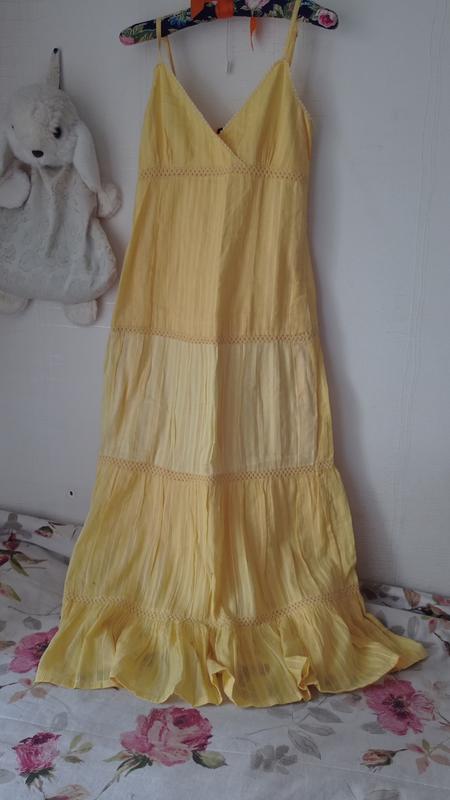 Сарафан в отличном состоянии, размер - 8, S. Хлопок, интересная фактурная ткань, подкладка, все отлично. Без посторонних запахов, домашний) Сзади резинка, не растянута, все хорошо. Брители регулируются. Подмышками - 40, но же резинка, тянется и вытачки. Под грудью - 40, талия - 42, бедра - 50, длина - 130, но же можно еще отрегулировать бретелями.