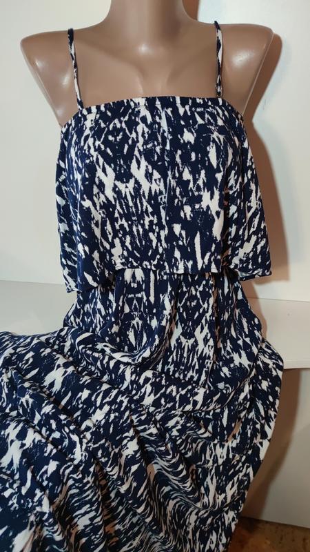 Длинное летнее сарафан платье На тонких бретелях Бретели регулируются Верх с оборкой, юбка длинная трапеция, низ оборка TOM TAILOR Размер S ПОГ - 45-50 см Пояс на резинке - 35-45 см ПОБ до 55 см Длина - 130 см Длина юбки от пояса - 98 см
