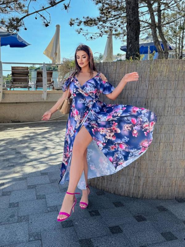 СУКНЯ НА ЗАПАХ 👗👗👗 Модель 1119 Легка вишукана сукня довжина макси Фасон «На запах», спідниця клёш Тонкі бретелі на зав'язках, з відкритими плечима та рукавами-крильцями на гумці Тканина: софт 1 розмір 48-54 довжина виробу від бретель 140 см ОГ від 100до 116