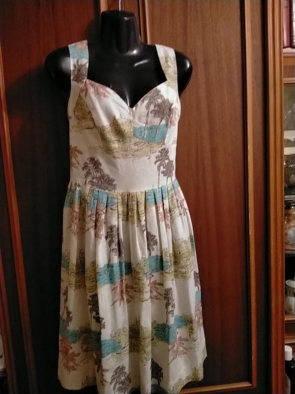 сарафан лен 55%, Котон 45%, monsoon, принт тропические пальмы на островах, на фоне не отделенного льна. Лиф продублирован этой же тканью, замочек на спинке. на юбке защипы. длина 99 + большой подгиб 6 см, Пог52 см, Пот 44 см. можно носить с поясом.