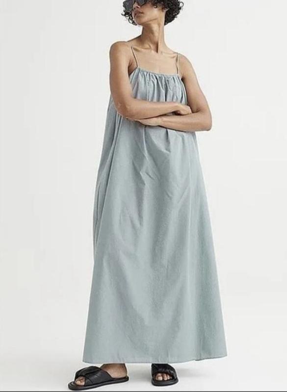 Платье макси из воздушного хлопкового плетения. Квадратный вырез горловины со сборками спереди, узкие регулируемые бретели и глубокий вырез горловины с горизонтальными бретельками сзади. Без подкладки. В очень хорошем состоянии.