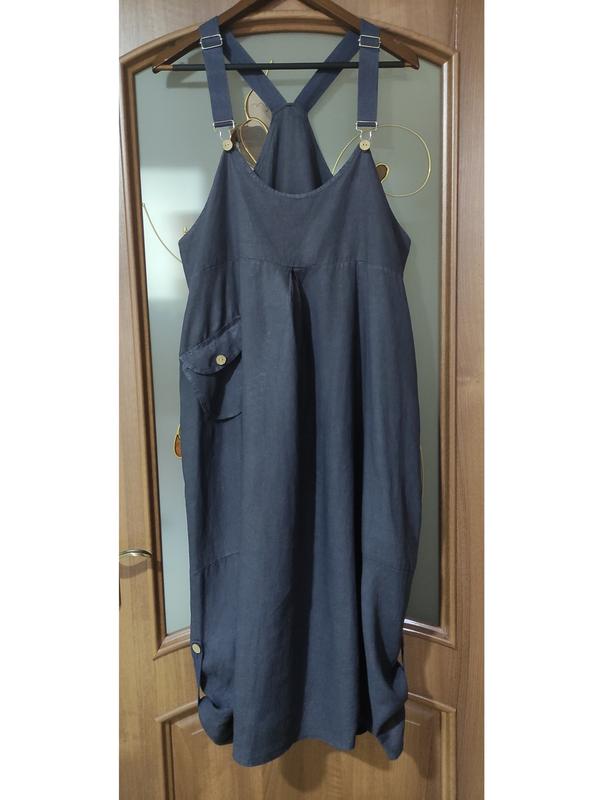 Льняной сарафан оверсайз / баллон (Италия). В идеальном состоянии. Цвет - темно-серый, антрацит. Размер универсальный - подойдет на L, XL, XXL, ориентируйтесь, пожалуйста, на замеры: длина от фиксации бретели (там где пришит пуговица) до низа - 101 см., ПОГ - 53 см., в бедрах - свободно. Брители регулируются. Можно носить на голое тело, в можно под сарафан надеть блузу, футболку или топ. Состав: 100% лен.