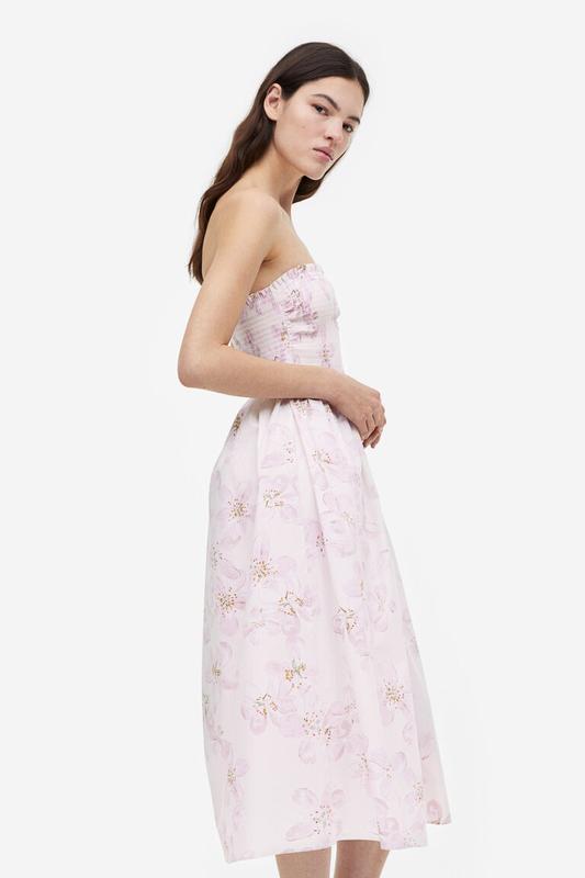 Сукня з бавовняної тканини. Топ зібраний на резинки, виріз у формі серця, оброблений рюшами. Вузькі, регульовані знімні бретелі. Без підкладки. 100% бавовна