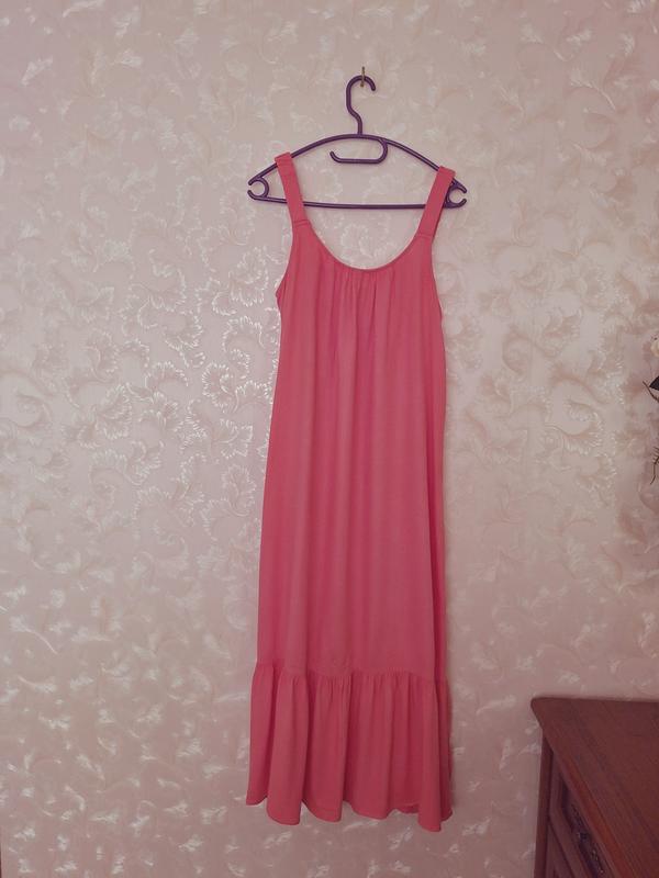 Сарафан легкий, максі, вільний, прямий крій, внизу оборка, бретелі-широка резинка, колір рожево-кораловий, розмір 10, стан ідеальний, 100% віскоза. Заміри: довжина з бретелею 125см., від пройми 100см., ПОГ 48-49см., стегна 48см.