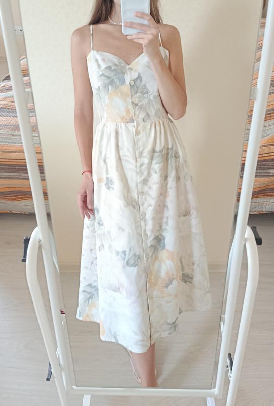 Красивый летний льняной сарафан H&M. Состояние отличное. Тканина не тягнеться. Есть подклад. Застежка пуговицы. Шлейки регулируются. На спинке резинка, тянется. Без кишень. Размер 40. 55% льон, 45% котон Подклад 100% коттон Длина со шлейками 116см, шлейки регулируются по длине Пог 48-50см Пот 40см Поб по подкладке 61см Оплата на карту!!
