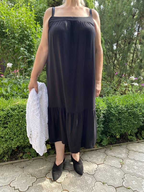 Літній сарафан чорного кольору. Дизайн мінімалістичний, нічого зайвого і обтяжливого. Сарафан на тонких бретельеах. Силует вільний, на спідниці ще ярус. Склад 100% віскоза. Тканина типу жатки.Довжину бретельки можна регулювати. По спинці резинка, щоб щільно прилягало. Зручно в спекотний день на відпочинку. До сарафана я далі виставлю білу мереживну накидку, яка створює чудовий ансамбль для літнього відпочинку. Сарафан розмір 16-18. Я приміряю на 18(44), 165 см . Мені комфортно. Дивіться заміри і замовляйте безпечну оплату, щоб приміряти . Заміри: НОГрудей 58 см Замір вище грудей де резинка по спинці 52 см ( під пахвами) Талія 64 см ( сукня вільна) Довжина від бретельки до низу 123 см