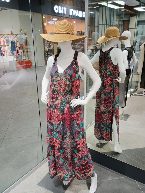 Вискозный летний сарафан в размере 16(170/100А),фасон настолько, что можно с размером смело экспериментировать, замеры :длина 139,Пог 50.На фото цвет получился ярче,в жизни приглушенный, спереди совсем немного украшен лелетками-блистками не налегчиво,при Желания можно убрать, но они в тему.Стан хорош.Размер манекена М