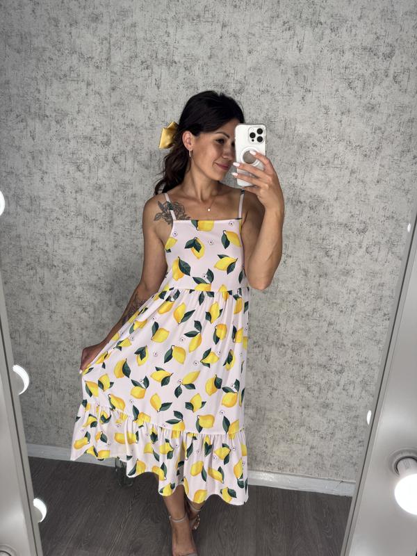 🍋Соковито, яскраво і по-літньому☀️неймовірна сукня з лимончиками на тонкі бретелі, які регулюються. 📌Розмір С 💰Ціна 250грн Ширина підмишками 44 Талія 43 Зріст на фото 168 см
