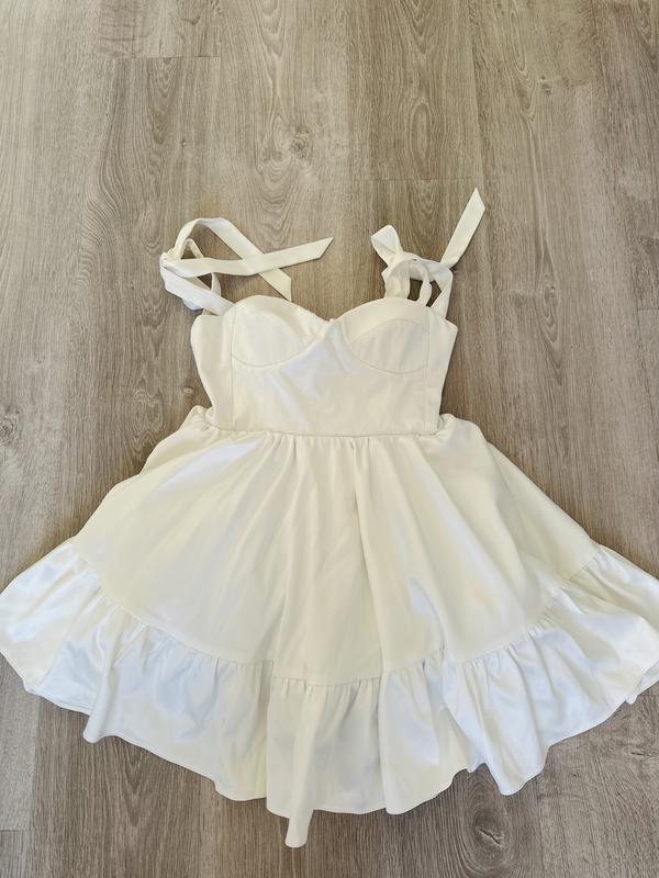 S: Довжина виробу - 61 см., Ширина по грудях - 44,5 см., Ширина по талії - 34,5 см. Матеріал Поліестр 100%; Матеріал підкладу: Бавовна 100% Сукня довжини міні виготовлена з високоякісної атласної тканини на бавовняному підкладі. Має корсетний крій, бретелі на завʼязках та декольте-бюстье. Чашка оздоблена виточками, що дозволяє комфортніше сідати по фігурі та підкреслює жіночність. Спідниця декорована ніжними рюшами та має додатковий підкладу з фатину що дадає обʼємності виробу. Фіксується прихованою блискавкою на спині. Одягався 2 рази