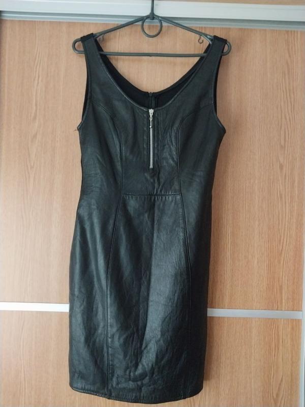 Платье-сарафан из натуральной кожи, ромир S. ПГ - 43 см, ПТ - 38 см, ПБ - 45 см, длина - 85 см. С натуральной киры спереди, спинка - плотная тянущаяся трикотажная ткань. Сзади имеет молнию.