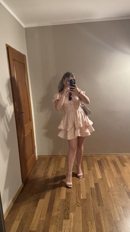 Ніжна коротка сукня з воланами Колір: пудрово-рожевий Розмір: L (підійде і на M) Легка і жіночна сукня з об'ємними рукавами та подвійною спідницею. Тканина приємна до тіла, гарно сидить по фігурі. Відмінно підійде для літа, побачень чи свят. Стан відмінний, одягнений лише один раз.