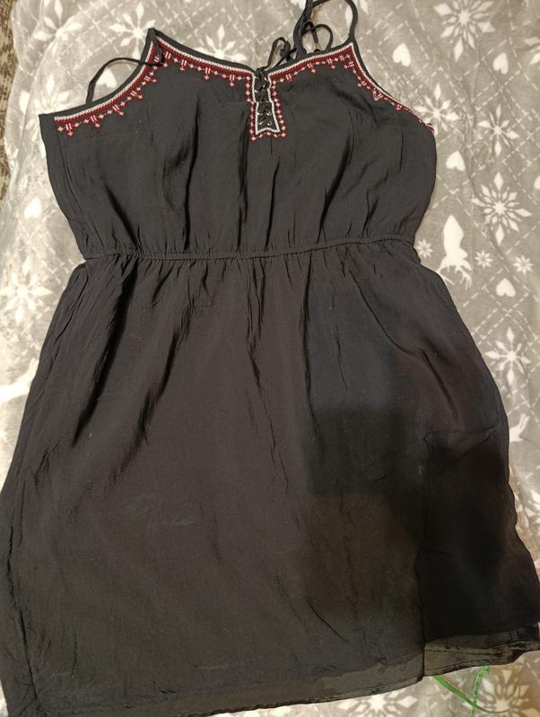 Красивый сарафан на бретелях в талии резинка. По краю красивый орнамент и шнуровка. Подмышками 51см По касте 43, тянется до 53 см Длина от подмышек 67см. Бретели регулируются по длине. Материал шелк на подкладке. Неумолимо легкий.