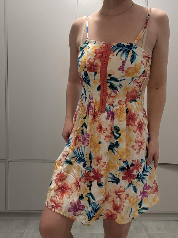Літній жіночий сарафан у багатобарвних кольорах, ідеально підходить для спекотних днів. Зроблено з легкої тканини з приємним принтом. Створений для комфорту та стилю в будь-який день. Розмір S Збоку блискавка Шлейки знімаються