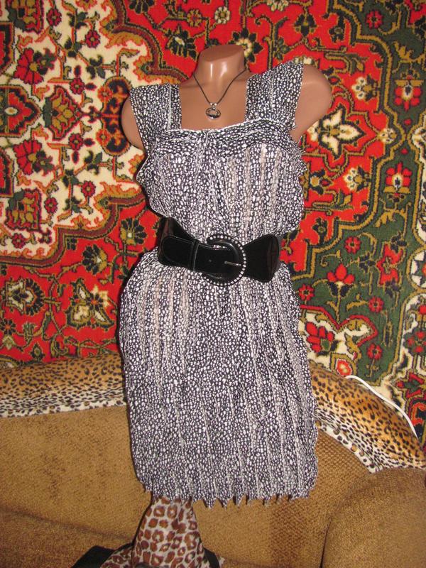 Классный сарафан из лёгкой струящейся ткани в рюши. Можно носить с поясом и без. Подойдёт от С до ХЛ. Ширина по верху 44 - до 56, в бёдрах 45- до 64, но лучше, если не сильно в натяжку) длина от плеча 86. В отличном состоянии.