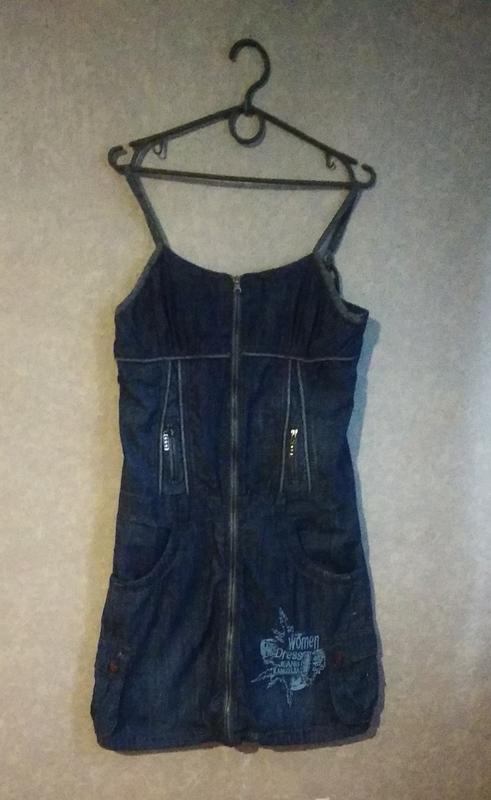 Джинсовый сарафан. Замок по всей длине. Спереди два внутренних кармана, сзади два накладных кармана, по бокам также накладные карманы. Размер по бирке указан XL. Замеры: ПОГ 42 - 44 см., ПОБ 54 см., длина 94см
