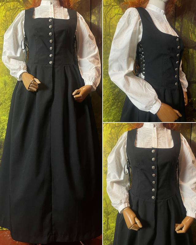Вінтажний довгий та пишний сарафан чорного кольору з містично-етнічним відлунням 🖤 Спідниця пишна в складку з двома кишенями, верх йде на металевих ґудзиках та бокам шнурівка. Сарафан, що вміє перевтілюватись: 🌿у поєднанні з сорочкою в етнічному стилі 🖤 з грубими черевиками та корсетним поясом - образ перетворюється на готично-містичний Розмір 44, заміри: ПОГ 45/50 см ПОТ 42/45 см ПОБ вільно довжина 135 см