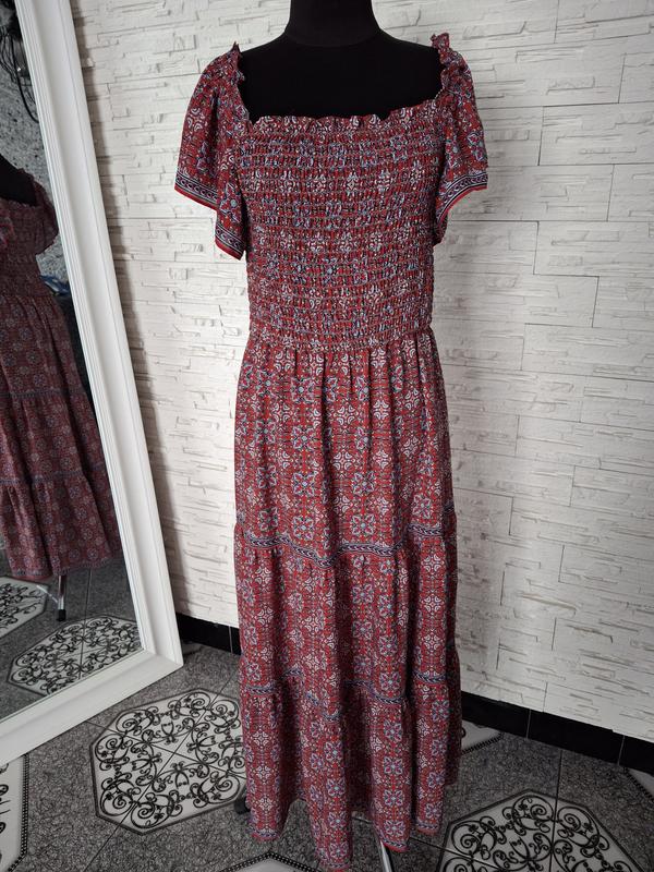 Легкое летнее платье на каждый день. Практичная и удобная. Красивый принт и винный современный цвет. До талии корсетом на милых резинках, а низ воланами. Модель всегда актуальна. Нова. Размер L. Манеке малый, поэтому платье не зелено. Смотрите замеры. Ширина в груди 40см Длина 130см