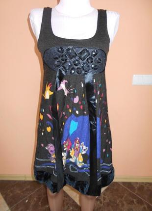 Тепленький сарафан в мультяшный принт. Есть тоненькая подкладка. Внизу сарафана велюровая вставка и камушки. Пог - 35-38см Длина - 85см