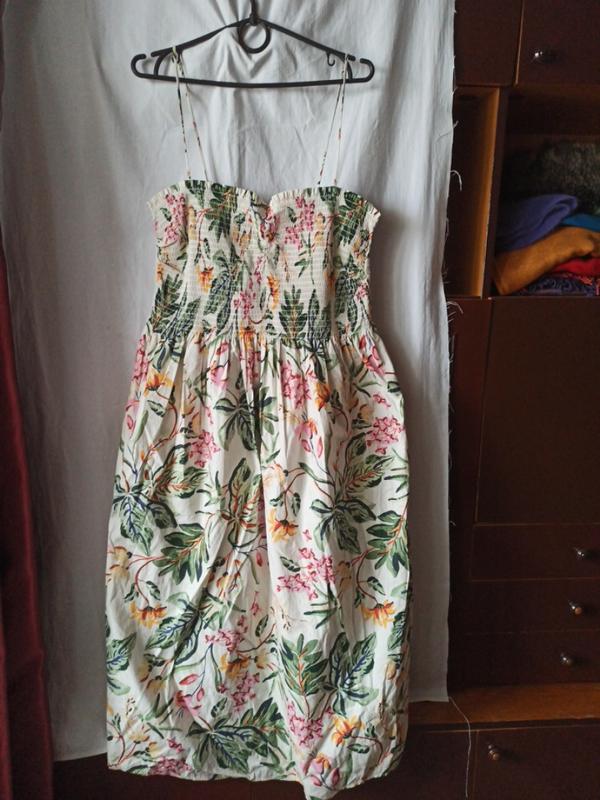 Яркий летний сарафан в принт из хлопка.Щельная ткань, держит форму, не просвечивает. Лиф на эластичной резинке, бретели регулируются. Можно также носить, например, поверх белой футболки. Ширина лифа в спокойном состоянии по груди 38 см, по талии 40 см, длина от начала лифа 105 см, от талии вниз 82 см. Стан нового. Продажа по полной оплате на карту.