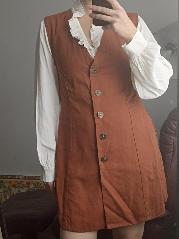 по низу швы необработанны, перешивался с пиджака, есть два кармана, очень клеящийся, в составе лен, можно носить и с брюками и как сарафан, одето на рост 169, длина 86