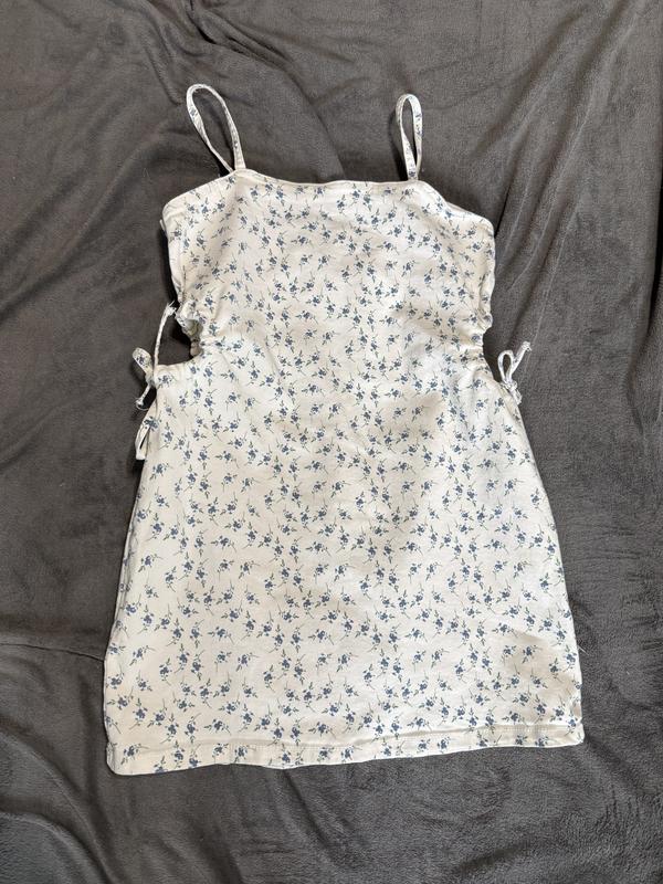 Джинсовий сарафан, тканина тягнеться. По бокам на талії вирізи. Довжина без лямок 65 см, з лямками 79 см, бедра 50.
