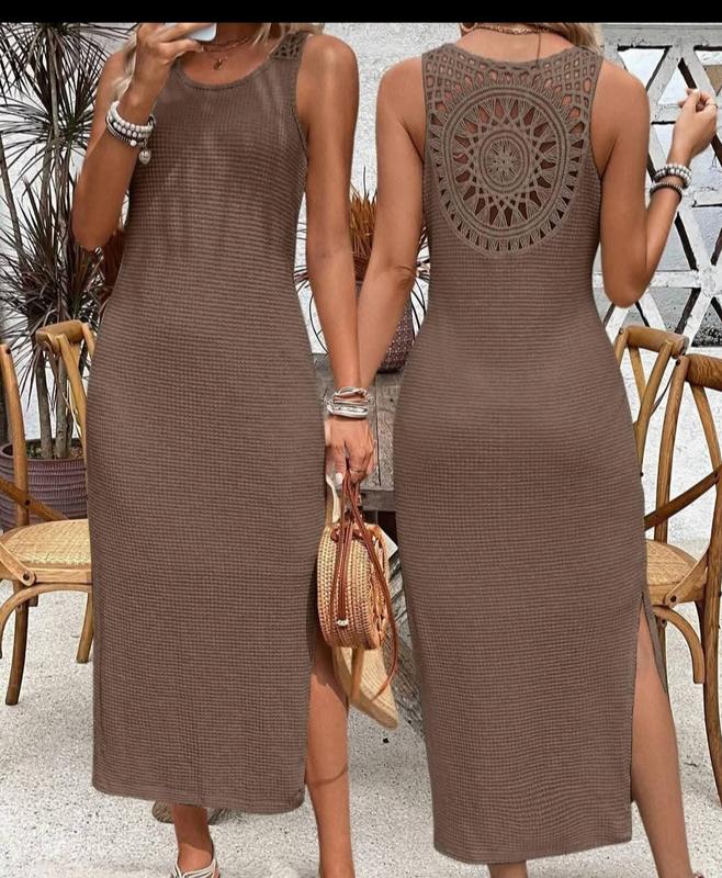 сарафан SHEIN на подкладке,цвет какао,с разрезами,по спинке узор с макраме.Размер L,ПОГ 50,длина 120 см
