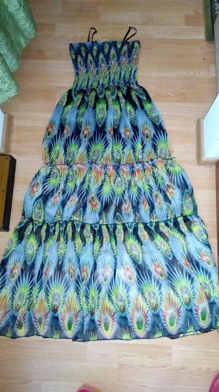 сарафан в отличном состоянии, без дефектов, размер универсальный от 42 до 48 за счет резинки на лифе. в середине чехол-подкладка до колена длина с бретелями 134, лиф тянется до 55, бедра свободные, подклад тянется до 60 торга и обмена нет, фото на фигуре не делаю, доп фото вещи предоставлю