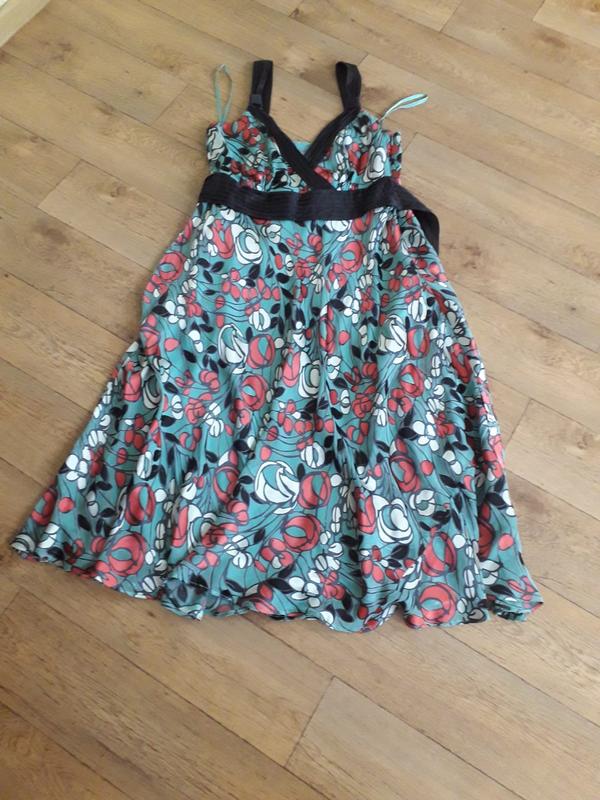 Сарафан из натурального шелка с контрастной отделкой по линии лифа и поясом. По линии лифа драпировка. На поясе застрочены складки. Пояс сзади завязывается бантом. В боковом шве потайная застежка молния. На подкладке. Сбоку по низу юбки спереди и сзади вставлен клин.