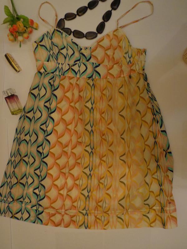Отличный сарафан на лето, тонкий хлопок, сбоку на змейке, есть боковые карманы, в боковом шве. Бретели регулируются. Недостаток: платье было на подкладе, но он удален, так как использовалось платье на жаркое лето, оставлен только на лифе, ткань не просвечивает. Основная мерка - это кокетка под грудью - 43 см, бедра 71 см, длинна от кокетки 60 см,высота лифа от высшей точки до кокетки 14 см + 4 см кокетка. Что касается груди: это сарафан, бретелька регулируется (как на лифчике) объем лифа делается за счет сборки возле кокетки.