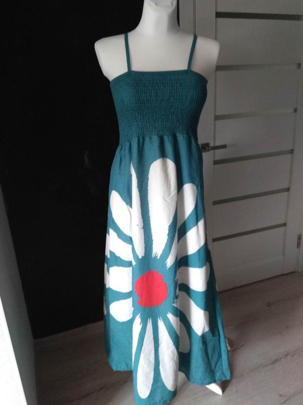 Сарафан в пол длинный хлопковый с красивой ромашкой. Сарафан на подкладке, лиф - резинка, красиво садиться на любого размера грудь. Бретельки тоже по длине регулируются. Можно носить беременным - очень удобно и красиво! размер s Замеры: Длина вся 114 см Длина лифа 19 см Юбка длина 95 Состояние отличное без дефектов!